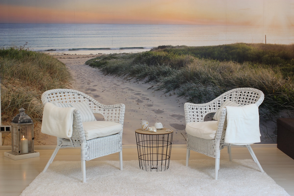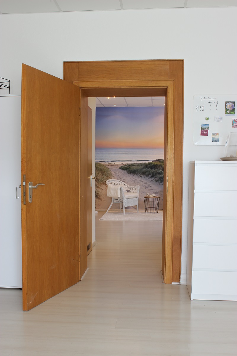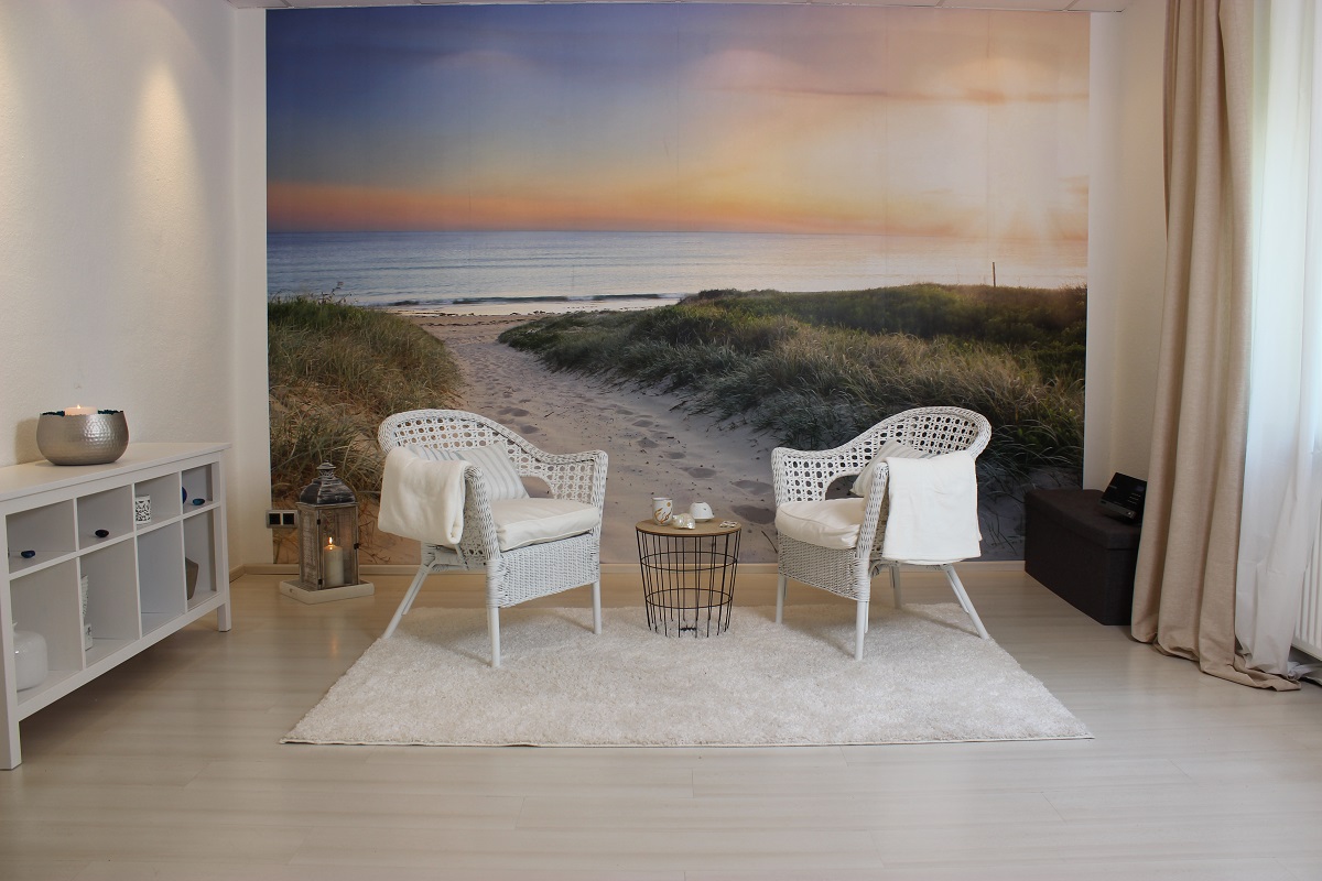 Der zweite Raum steht unter dem Motto „Meer der Unendlichkeit“. Was passt da besser als eine Szenerie mit einer Abendstimmung und einem Weg, der durch eine Düne zum Meer hinführt? Wenn man von der Tür aus in den Raum hineinschaut, dann bekommt man das Gefühl direkt auf einen Strand zuzugehen. Wir folgen in den Sittings ja oft den „Spuren im Sand“…