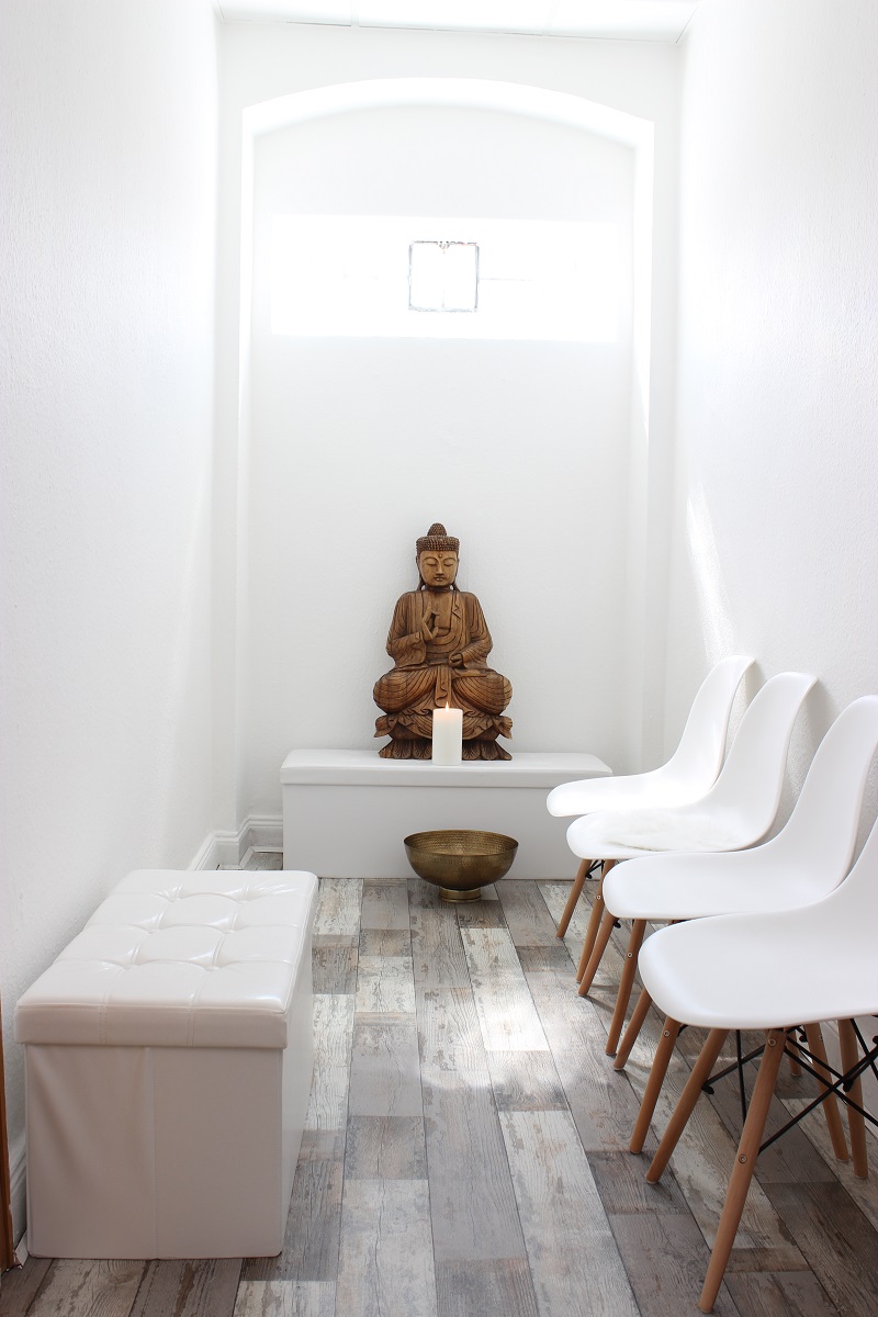 Der Wartebereich ist ein heller Flur mit einem Buddha als Herzstück. In einem Regal finden sich ausgewählte Bücher und Zeitschriften, die sich mit spirituellen Themen beschäftigen. Natürlich fehlt es auch nicht an Spielsachen und Malutensilien für die kleinen Besucher mangeln, die oft mit ihren Eltern zu einem Termin kommen.
