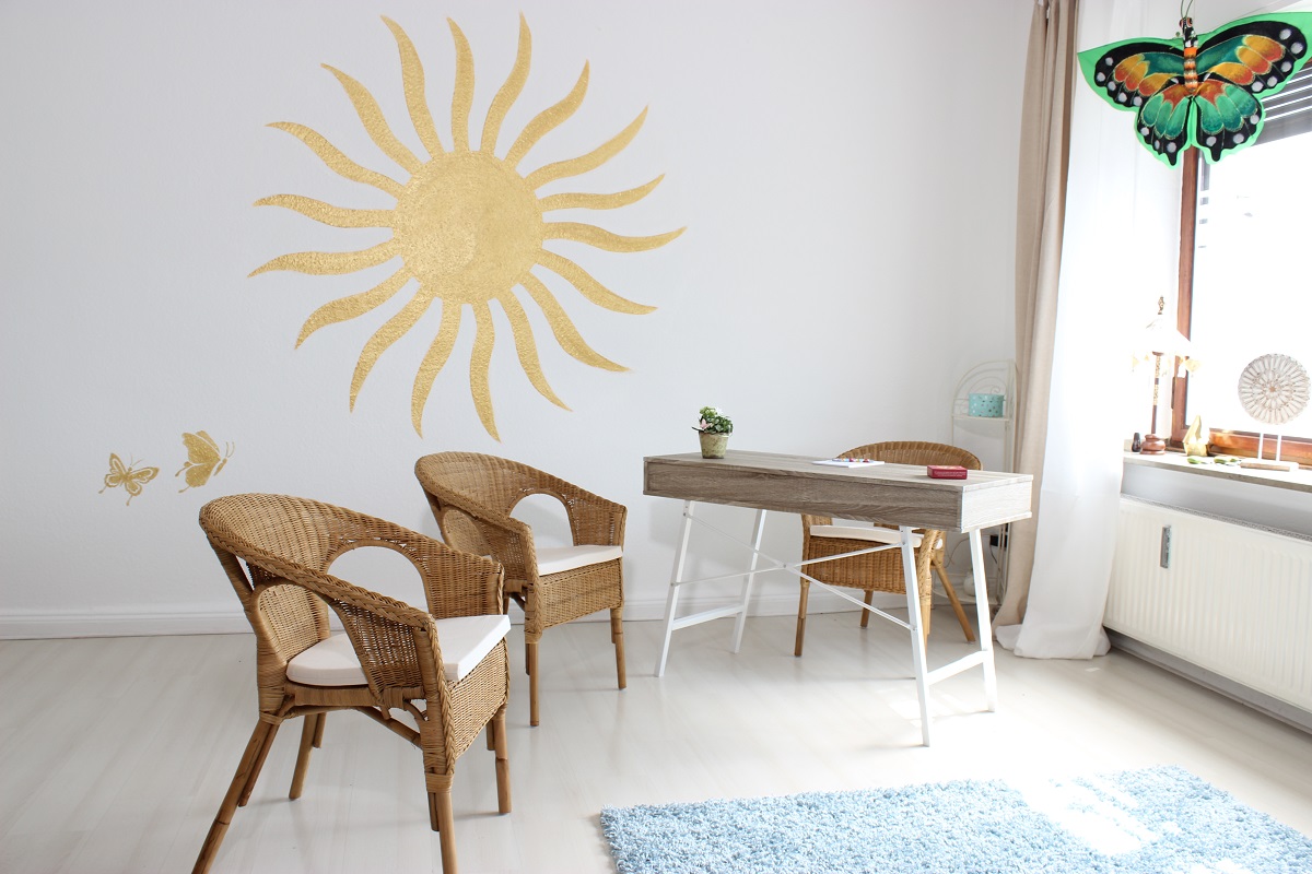 Im nächsten Raum findet man eine gemütliche Couch und Korbstühle sowie einen Schreibtisch. Die Sonne und die Schmetterlinge, die die Wand zieren, sind von einer jungen Kunst- bzw. Designstudentin gemalt worden. Die Schmetterlinge, die im Fenster herumflattern, sind ein Geschenk aus Bali von einer deutschen Freundin.